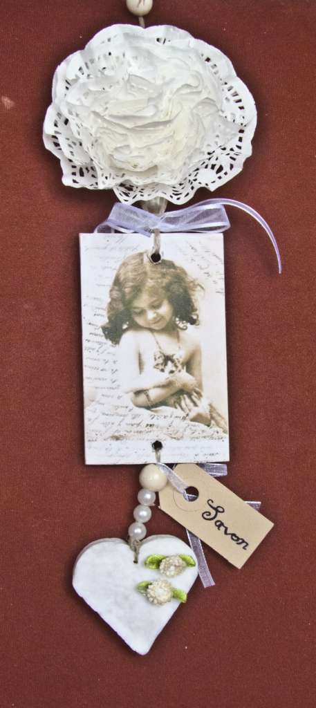 Zeepketting met houten label en papieren roos. Nostalgisch plaatje kan afwijken.